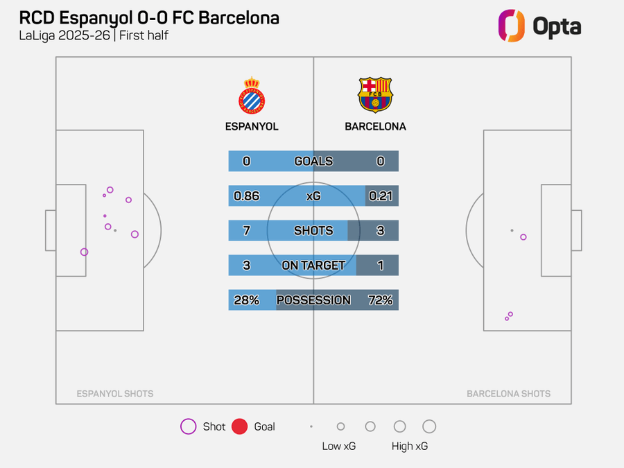 據(jù)統(tǒng)計(jì),西班西甲巴塞羅那上半場僅有三次射門,牙人這是射門他們本賽季西甲聯(lián)賽上半場射門次數(shù)最少的一次。