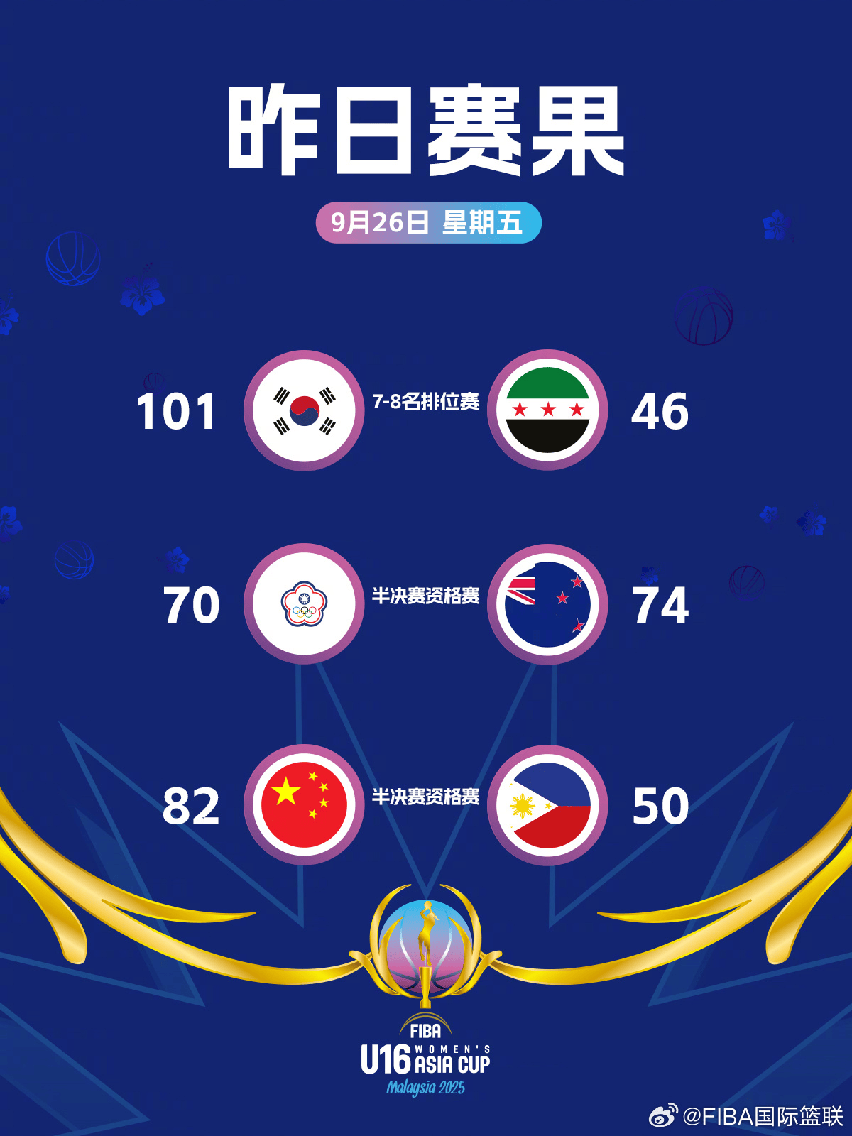 虎撲09月27日訊 FIBA官方社媒公布U16亞洲杯比賽日戰(zhàn)報(bào)。
