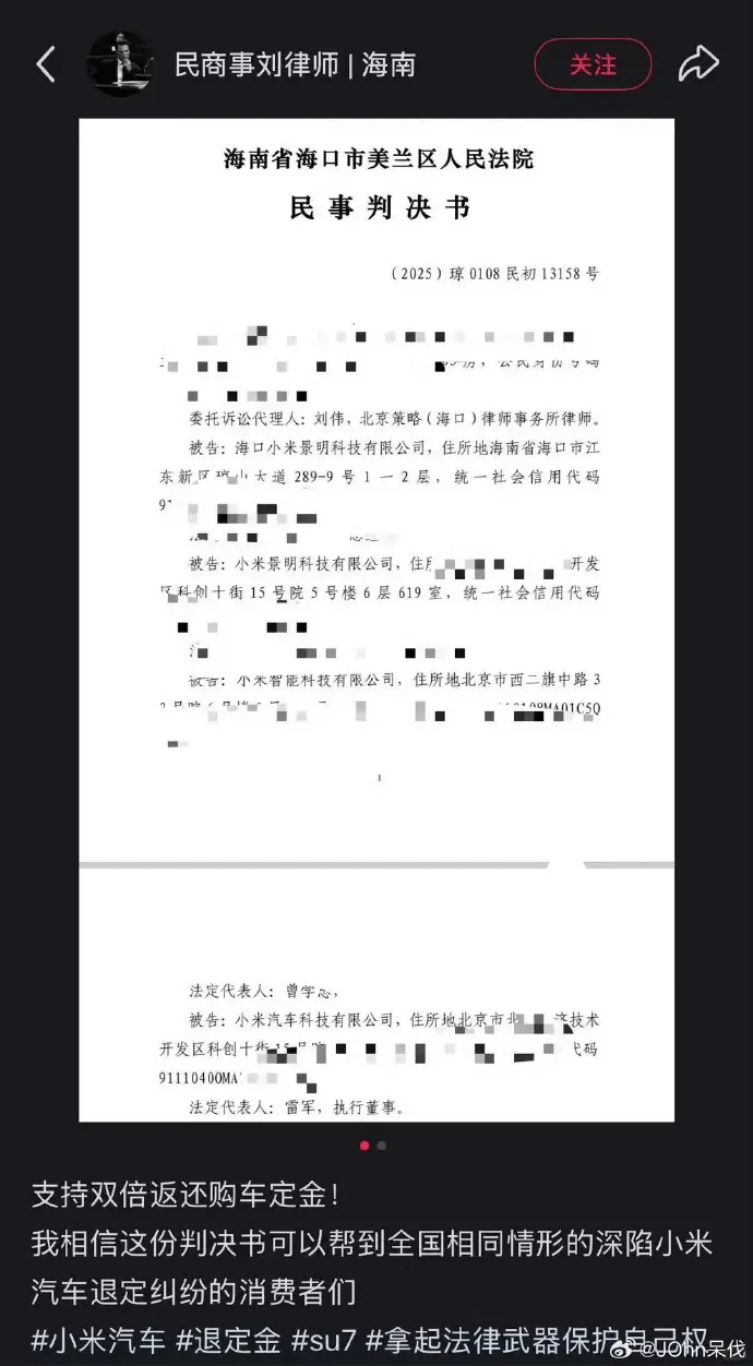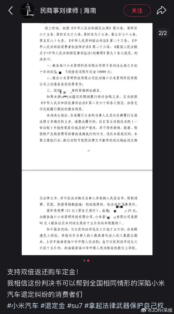 小米汽車自己單方面改變合同,被車主拒絕。心下既然轉(zhuǎn)頭就沒收人家5000的大企定金。。